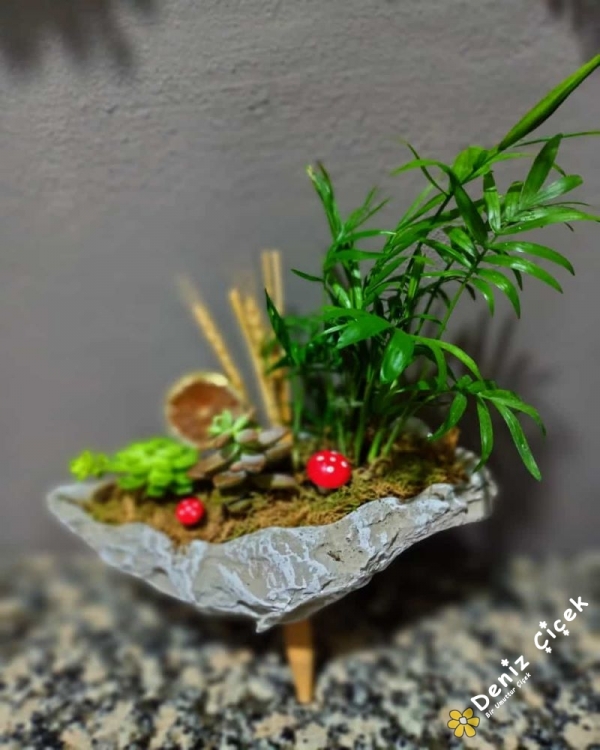 Ürün Kodu : 3796Taş Kayık saksı içerisinde sukulent ve doğal yosun üzeri kuru bitki süslemesi yapılmıştır. Sukulentler, bakımı kolay ürünlerdir. Çok fazla sulamaya ihtiyaç duymadan uzun süre canlı kalırlar. Haftada 1 kez sulanması yeterlidir,